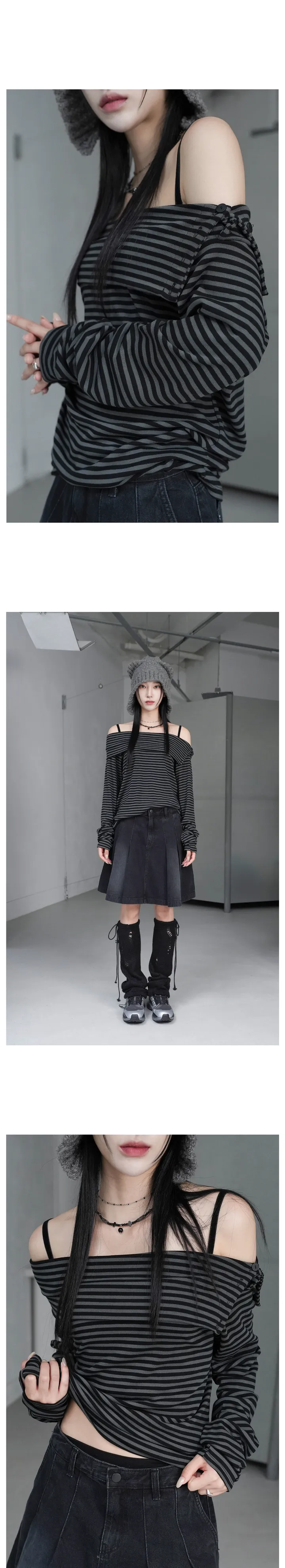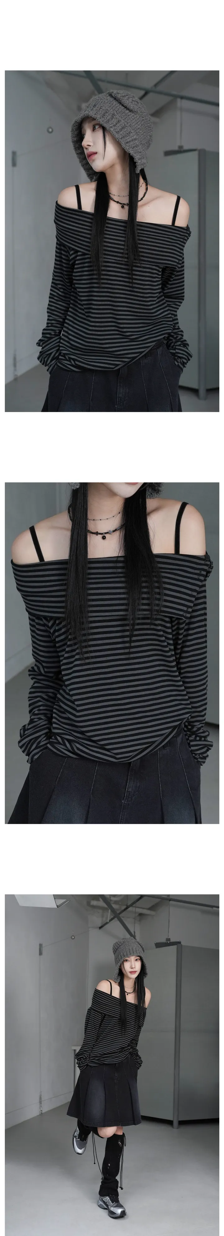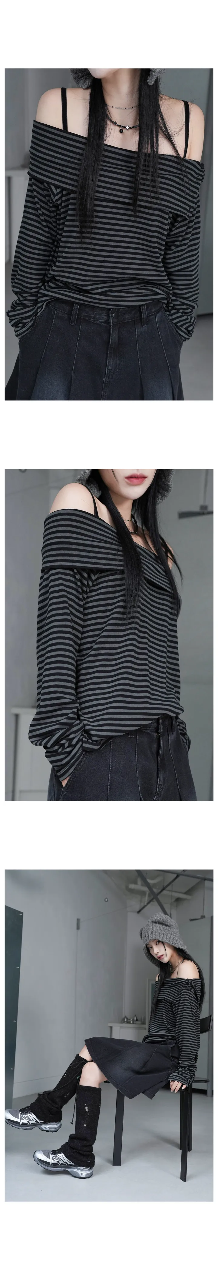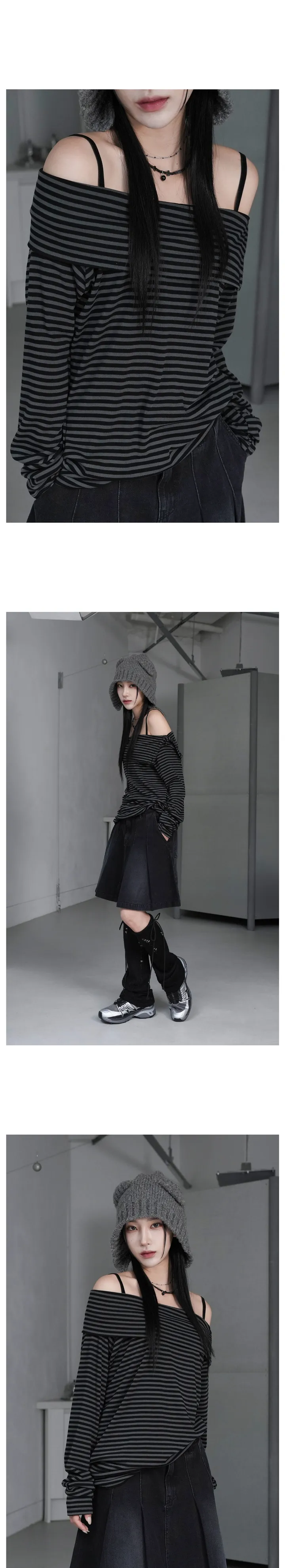 (BINARY01) Lazy Off Shoulder Striped T-Shirt (charcoal)
