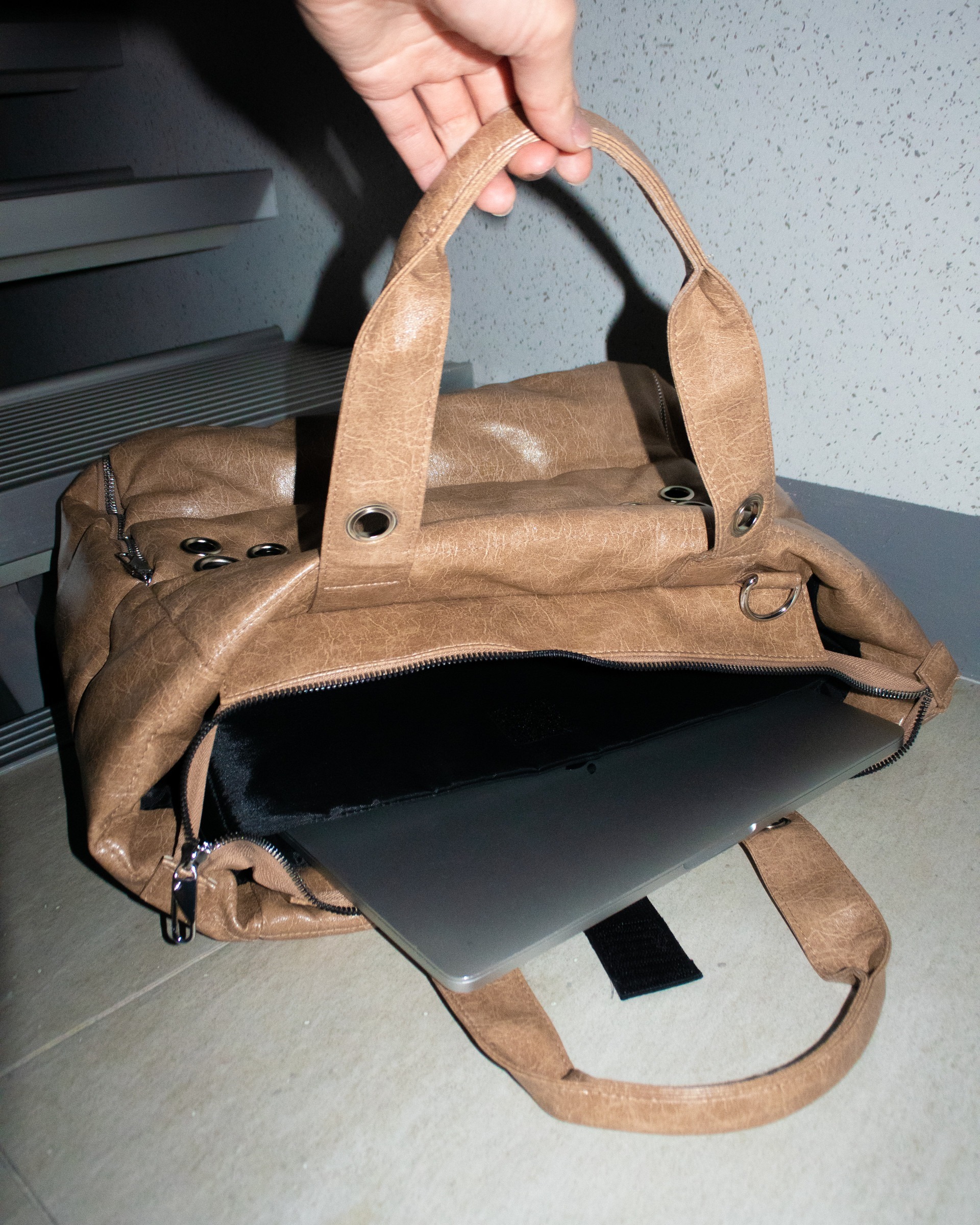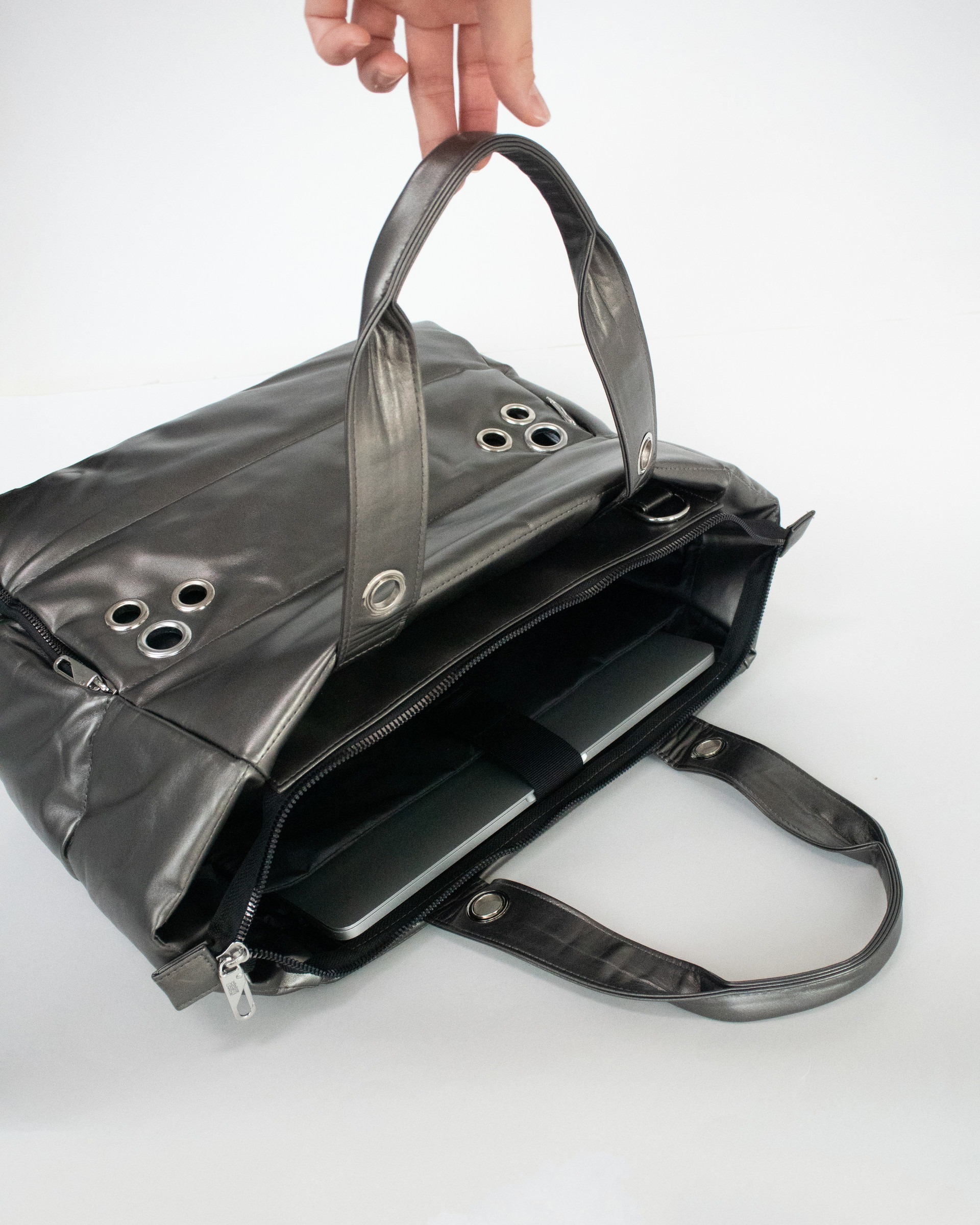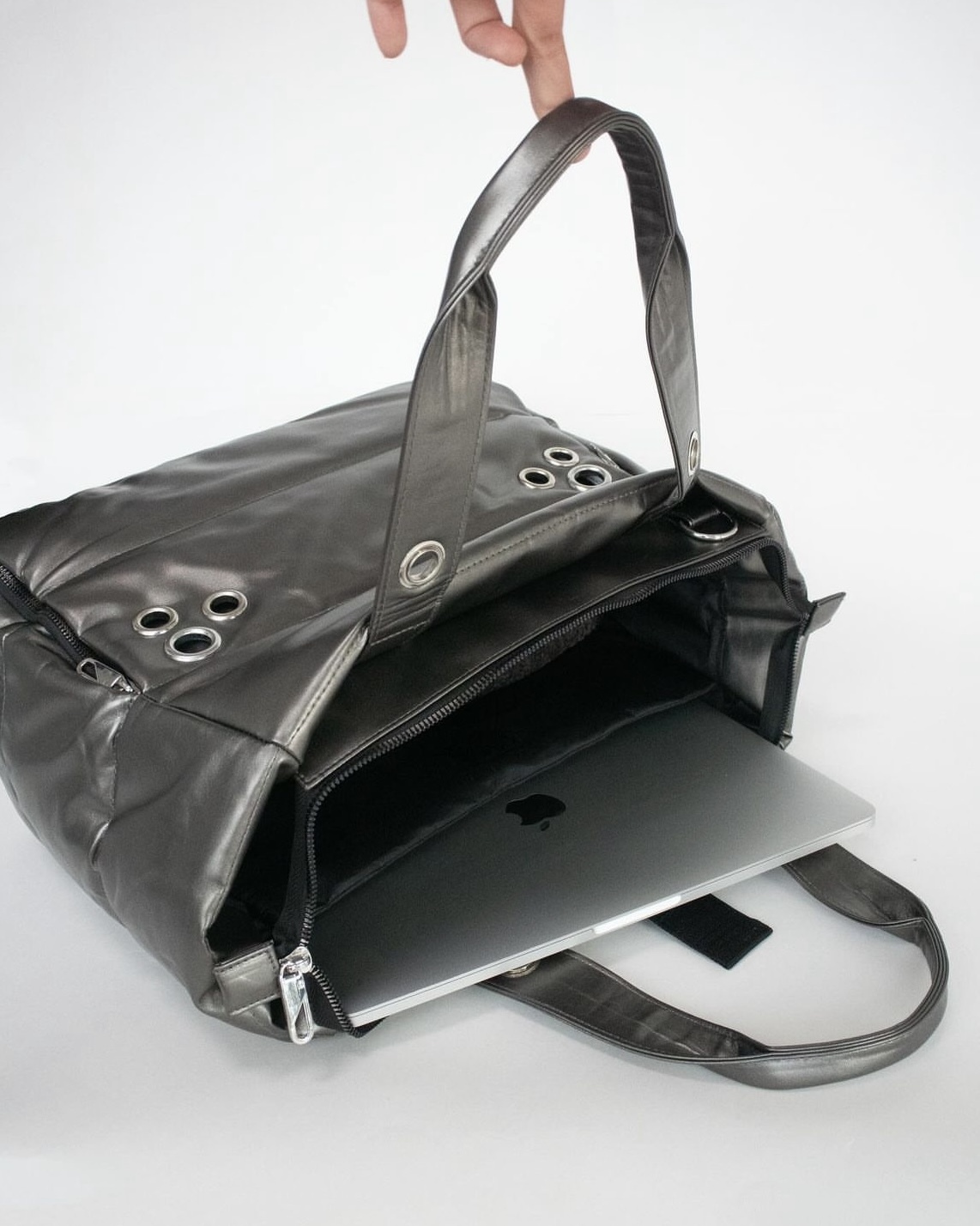 內部加設了筆電口袋,避免筆電直接接觸到底部。外部口袋拉鍊頭採用了方便扣合的環扣設計。