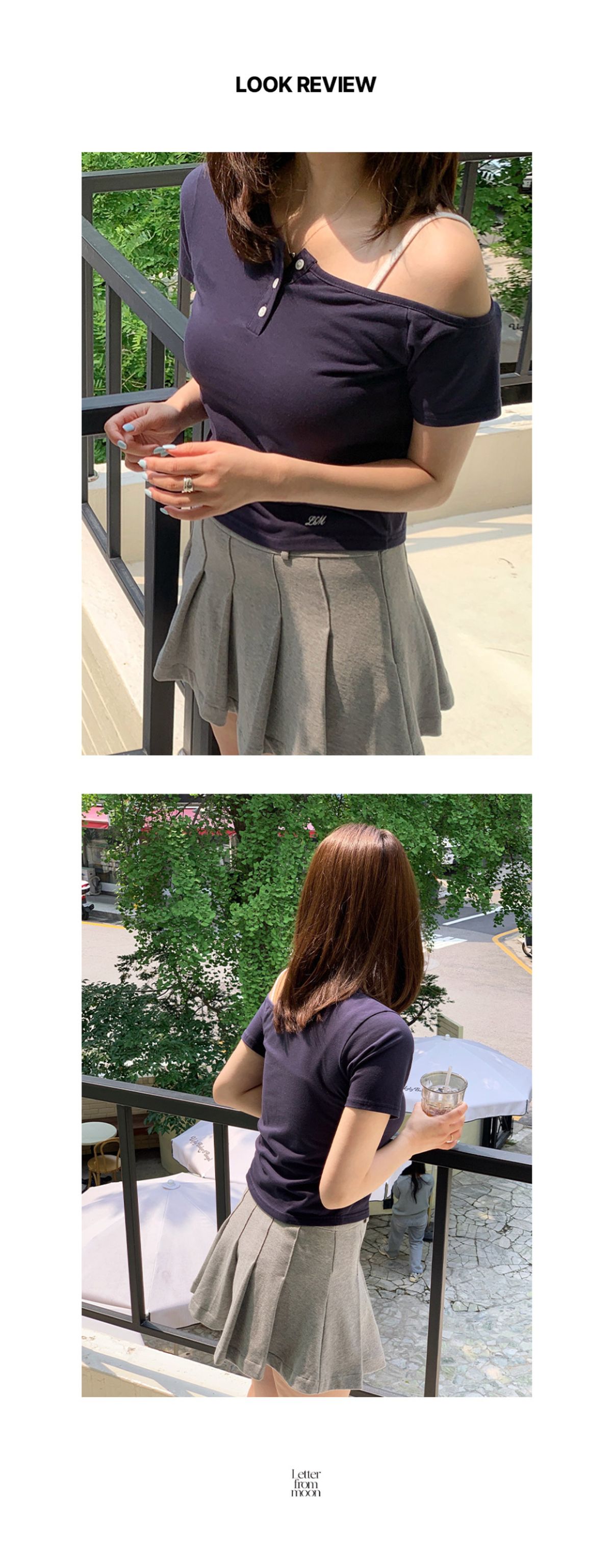 (LETTER FROM MOON) Half Off Shoulder Button T-Shirt ( Navy )